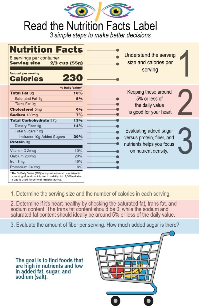 This double-sided card breaks down the Nutrition Facts label step-by-step, helping shoppers quickly understand:
